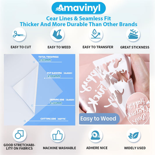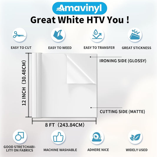 Amavinyl White Heat Transfer Vinyl Roll, 12'' x 25ft White Iron on Vinyl, Compatible with Cricut Machines, White HTV Vinyl for T-Shirts Design