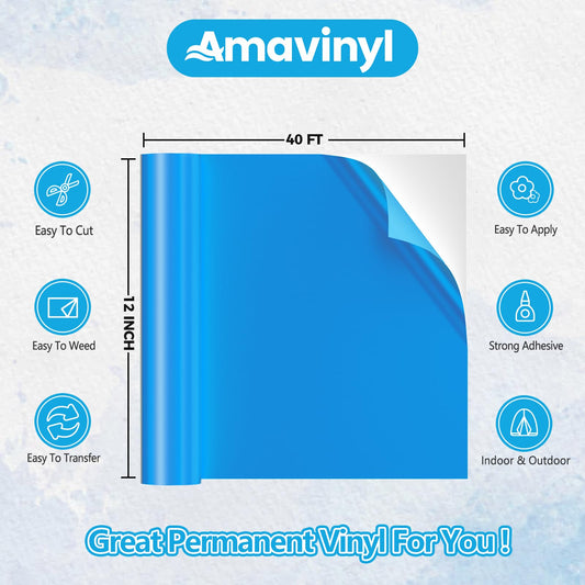 Amavinyl 12'' x 40 FT Gloss Blue Permanent Vinyl for Cricut Silhouette, Blue Sticker Vinyl, Impervious Adhesive Blue Vinyl Roll Weatherproof, Use on Vehicle Cup Glass Decal Outdoor Decor