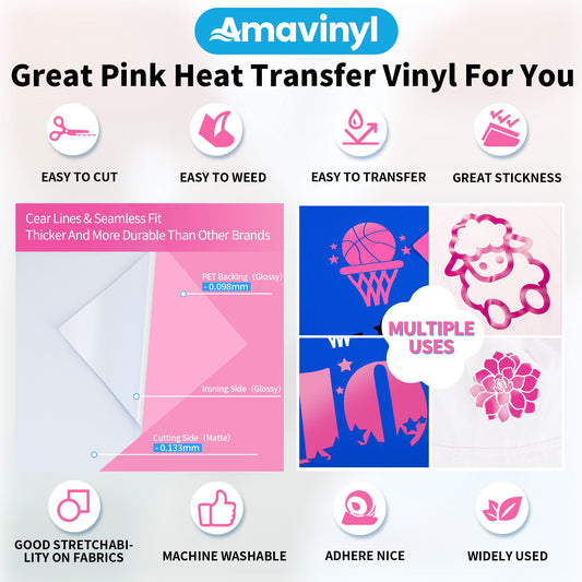 Amavinyl Pink Heat Transfer Vinyl, 12'' x 10ft Pink Iron on Vinyl, Compatible with Cricut and Cameo Cutter Machines, Pink HTV Vinyl for T-Shirts Design